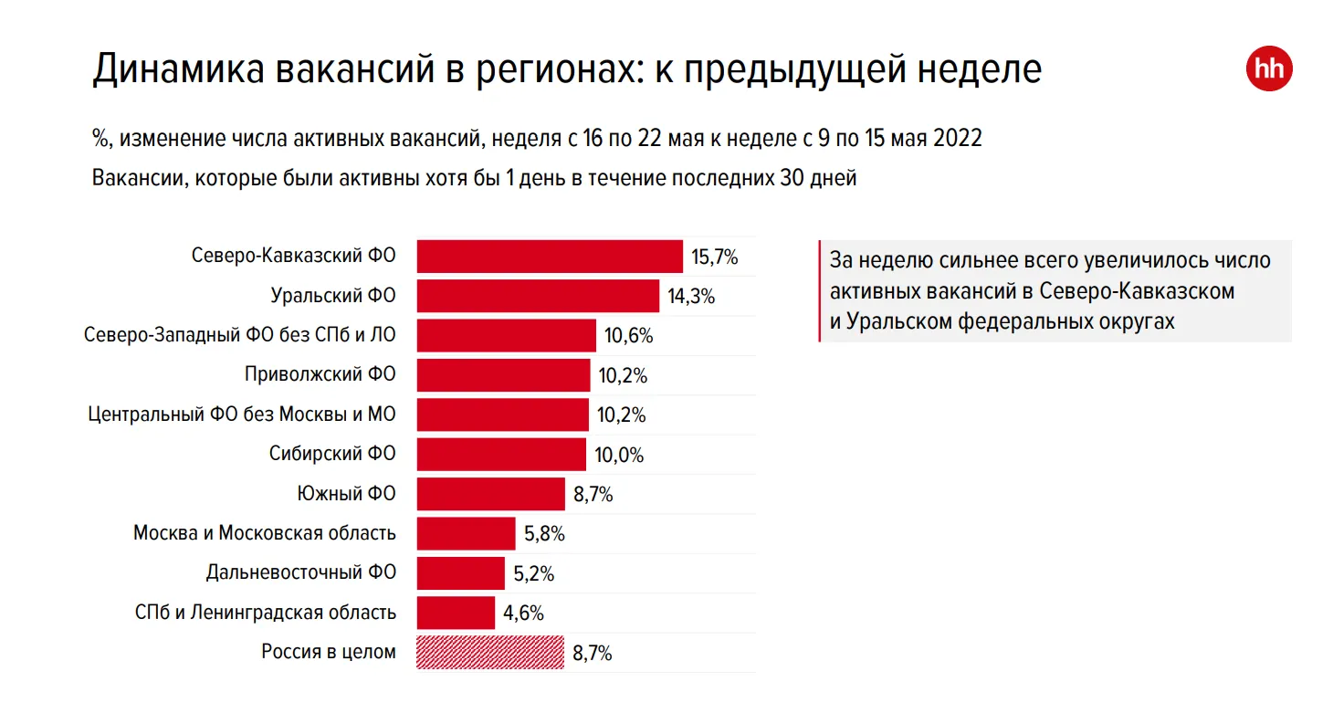 Итак, число активных вакансий увеличилось на 8,7%. Рост наблюдается во всех регионах, но наиболее заметно — в Северо-Кавказском и Уральском федеральных округах. При этом рост количества резюме замедлился — за это время их стало больше всего на 6,1%.