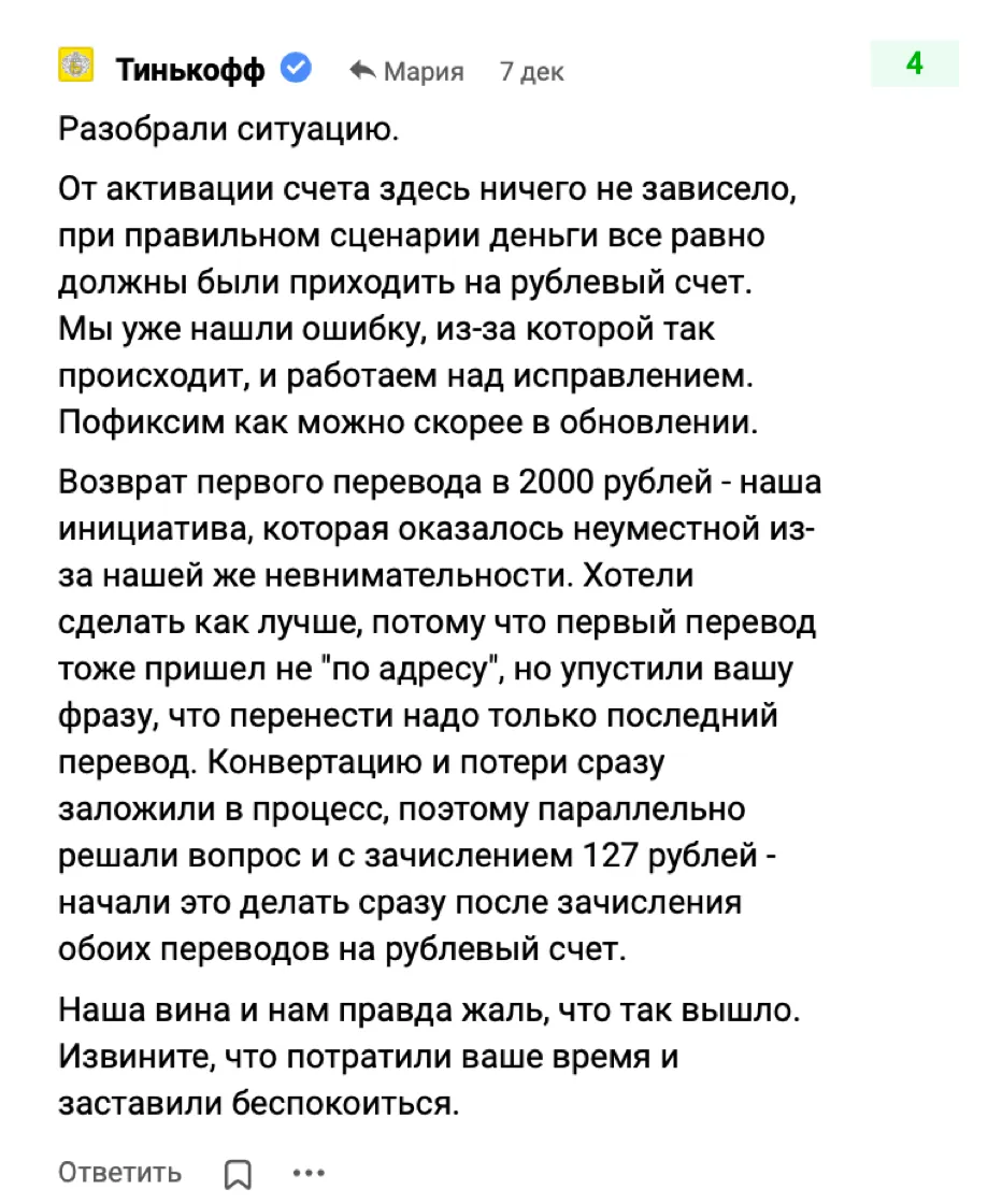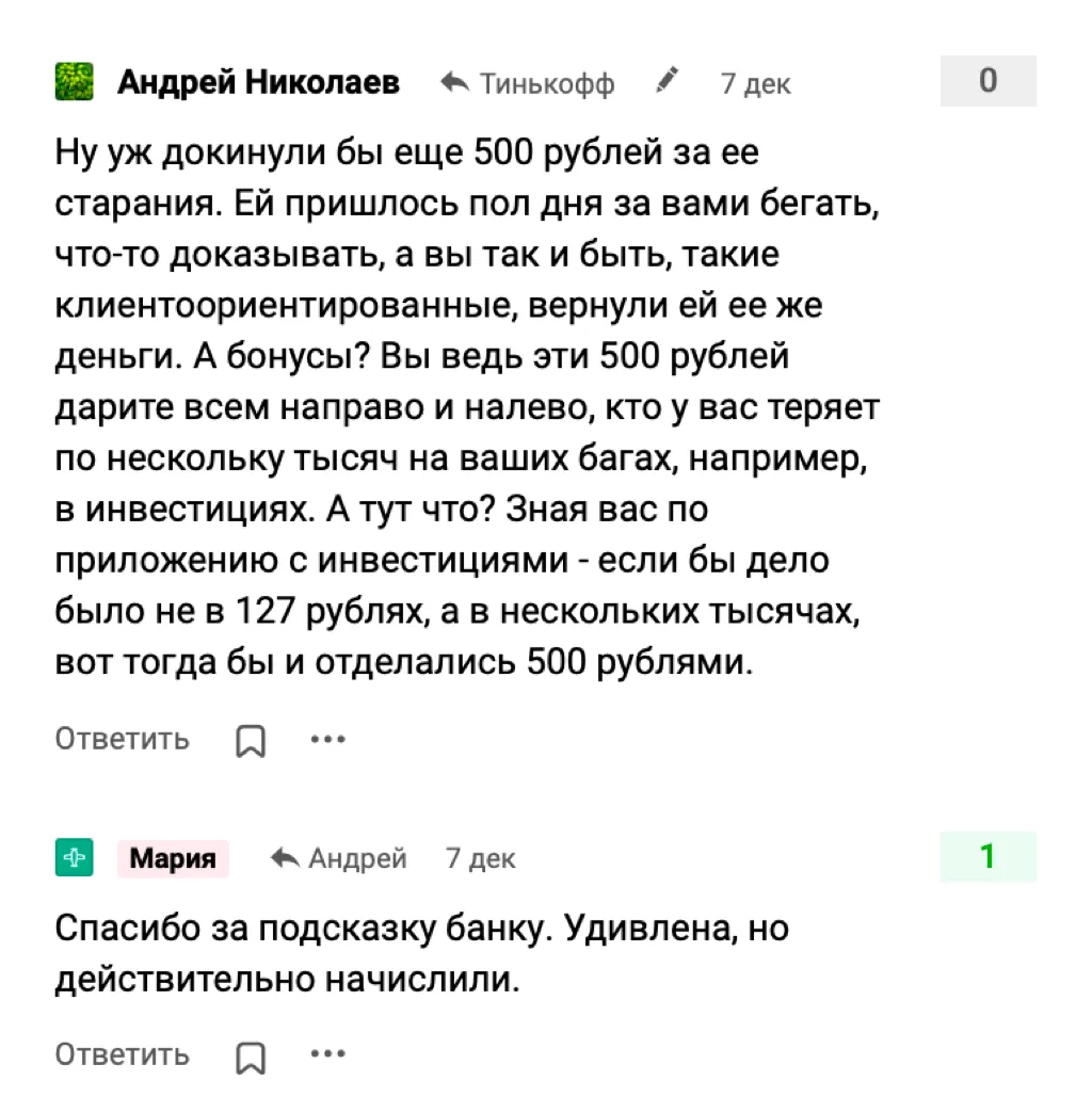 Поэтому важно смотреть, на какой площадке оставлен негативный отзыв, и индивидуально подходить к каждому случаю. Посмотрите, как справился банк Тинькофф. Перед клиентом не только извинились, признав свою неправоту, но и, прислушавшись к мнению ещё одного пользователя, начислили денежную компенсацию. Кстати, готовность компенсировать неудобства тоже очень важна.