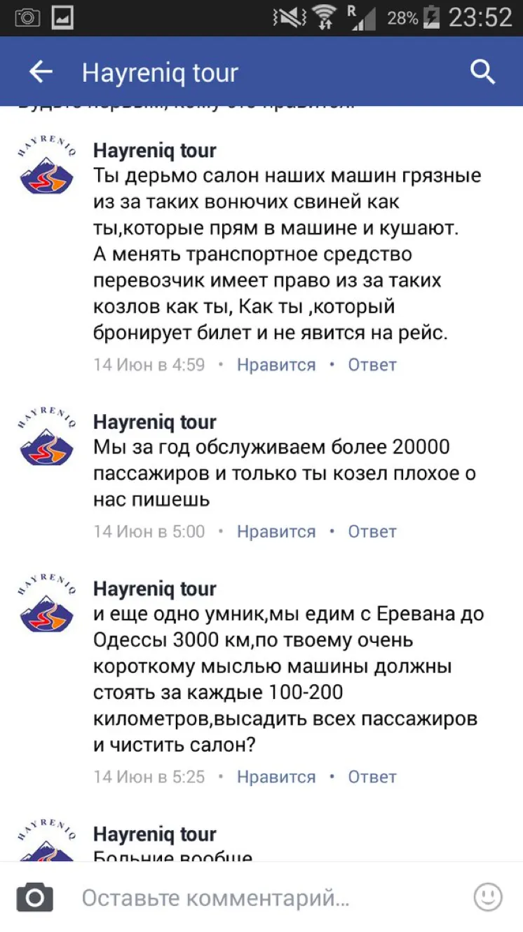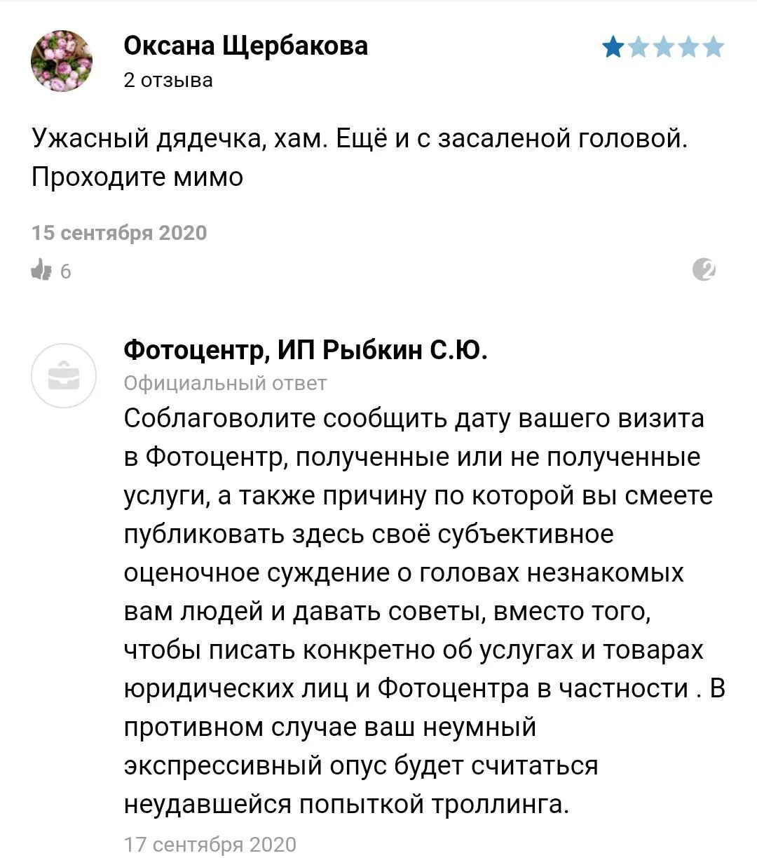 И совершенно недопустима агрессия в адрес клиента, даже недовольного. Вот так делать нельзя. Сотрудник, который, вероятнее всего, является владельцем этого бизнеса, отвечает совершенно неадекватно, в пять часов утра, постит несколько сообщений подряд, в которых крайне агрессивно отзывается о клиенте. Он явно забывает, что интернет хранит всё, и переписку могут прочитать другие люди, которые, конечно, после такого выпада не захотят пользоваться услугами компании.