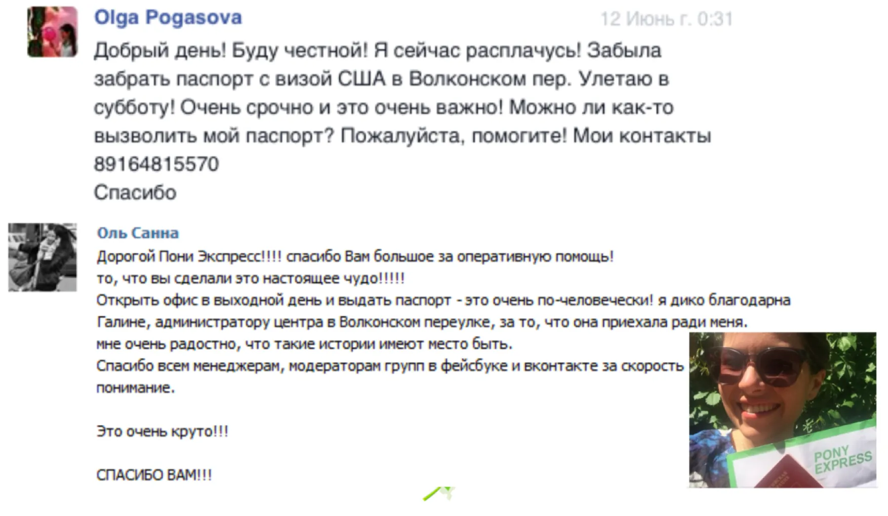 Я уже говорила, что на проблемы клиентов нужно реагировать оперативно. Посмотрите, как здорово с этим справилась логистическая компания Pony Express, у которой в том числе есть визовые центры, где они помогают оформить документы. Девушка забыла забрать паспорт с визой в США и обнаружила это вечером в пятницу. В субботу ей улетать — а визовый центр в выходные не работает. В итоге директор визового центра лично поехала на работу в свой выходной и выдала девушке паспорт. Компания получила лояльного клиента, который к тому же во всех соцсетях написал о том, насколько успешно компания решила проблему.