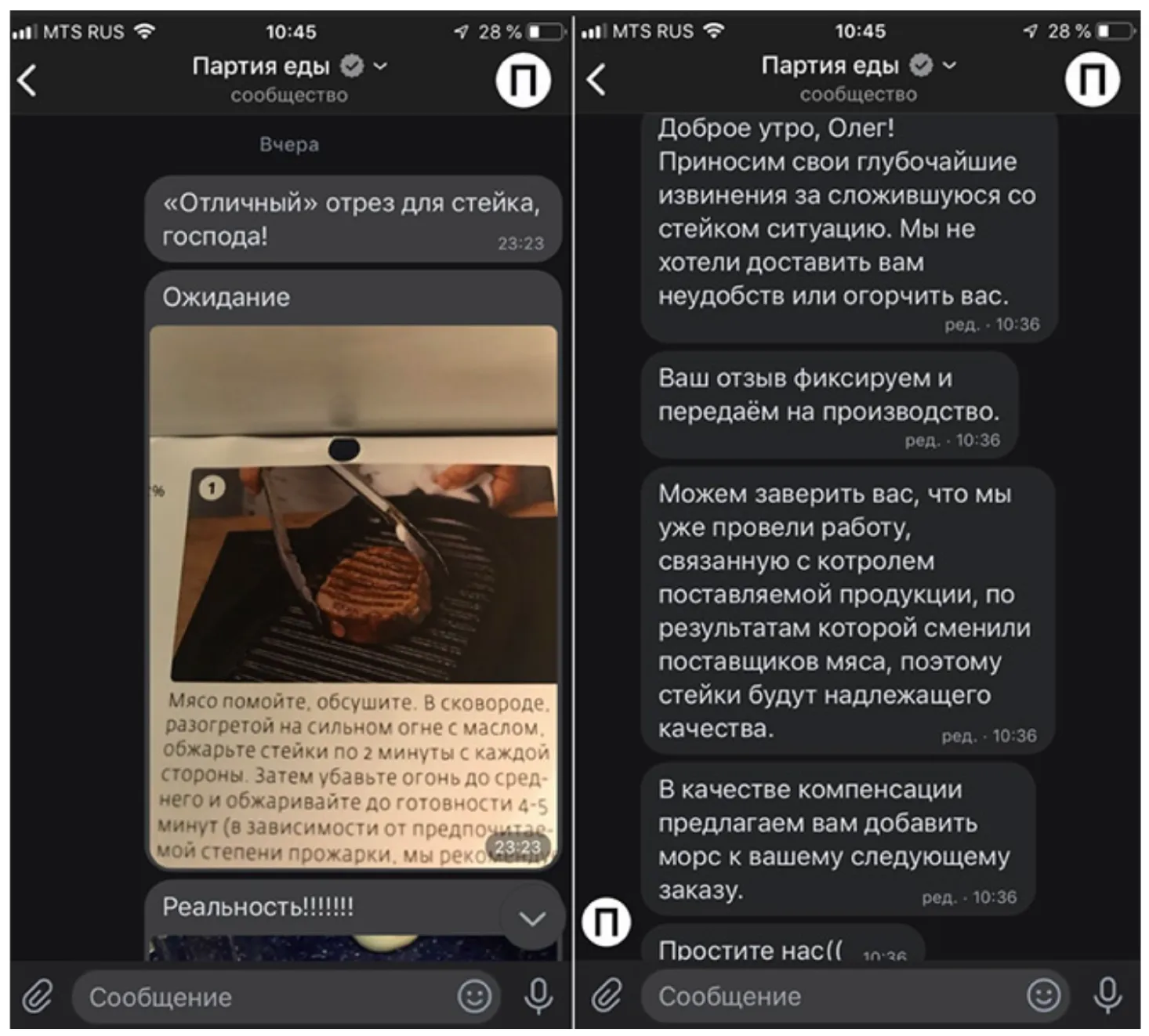 Во-вторых, не нужно делать вид, что вы решили проблему, если в реальности она сохраняется. В этом кейсе мы видим, как на отзыв, поступивший поздним вечером, компания отреагировала наутро — и сразу же заверила клиента, что уже сменила поставщика. Это выглядит очень подозрительно, потому что подобные решения не принимаются за минуту на основании одного отрицательного отзыва. Да и морс в качестве компенсации за испорченный стейк выглядит сомнительно. Так что, если вы решаете проблему клиента — решайте её адекватно и в реальности, а не только на словах в интернете.